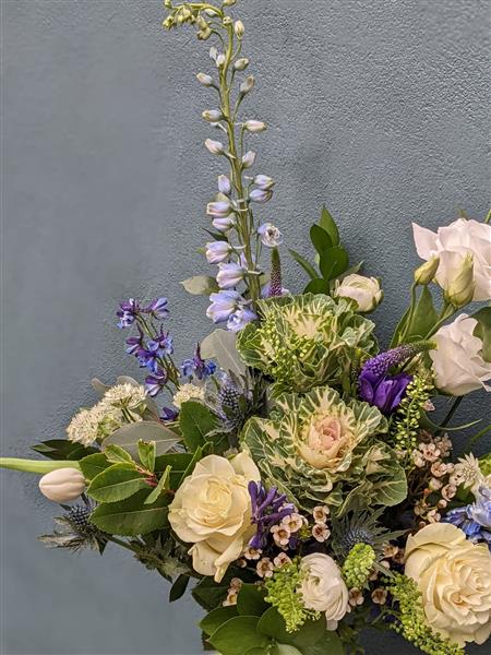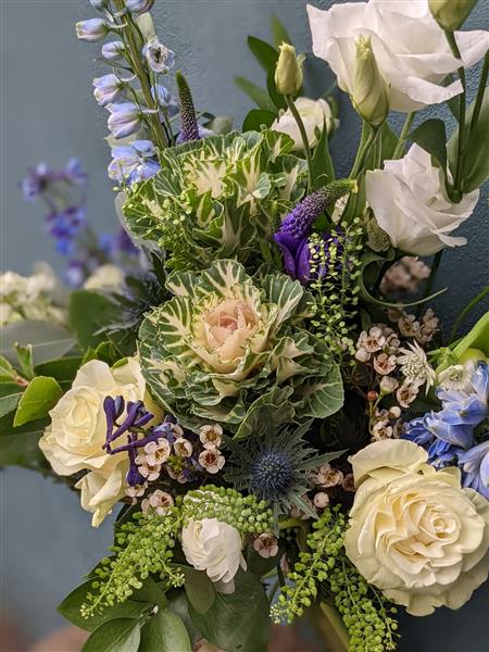 A truly beautiful bouquet for a loved one in sumptuous creams, whites and blue with lush foliage to compliment.