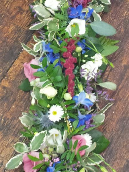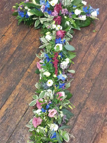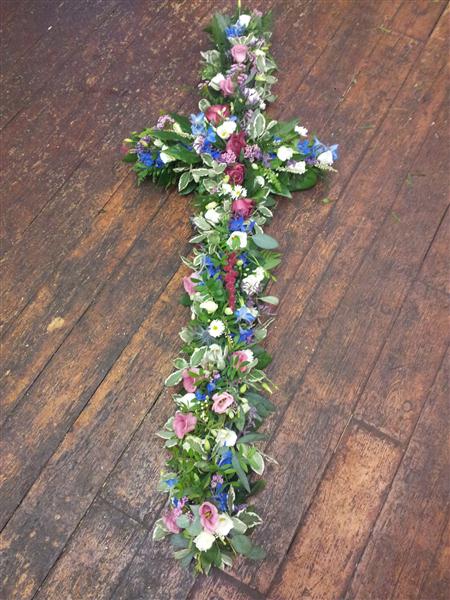 A beautifully styled 2ft length cross. With pretty pink roses and blue delphinium. Can be made with any other colours or flowers of your choice.