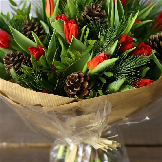 A chunky hand tied posy of red or white Dutch tulips, pines cones and seasonal foliage. In the words of Anto Sharp, 'oooh that's going straight in my basket!'